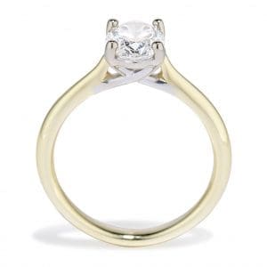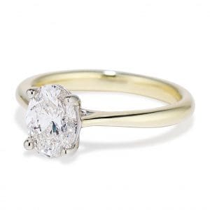 This 1.40ct Oval Diamond is set as a elegant solitaire with a narrow yellow gold band and white gold prongs.