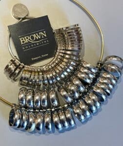 If you’re planning a complete surprise, it can be tricky to get her ring size without her knowing. We recommend bringing in a ring she might already wear and won’t notice its short disappearance. Or we can guide you in a ring choice, or design, that can be easily re-sized once you propose.