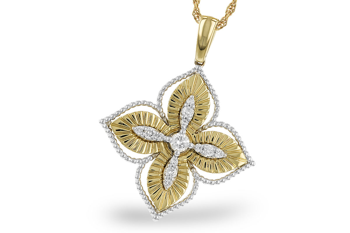 This elegant pendant, crafted in 14k yellow gold, showcases a radiant quatrefoil design inspired by the delicate beauty of a flower. It features sparkling round brilliant-cut diamonds artfully placed to enhance the intricate details of each petal.