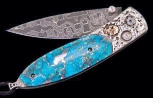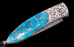 The Monarch ‘Last Call’ features an elegant frame in hand-carved sterling silver, inlaid with ‘zinc-matrix’ turquoise. The blade is hand-forged ‘Intrepid’ Damascus by Chad Nichols; the one-hand button lock and the thumb stud are set with white topaz gem stones.