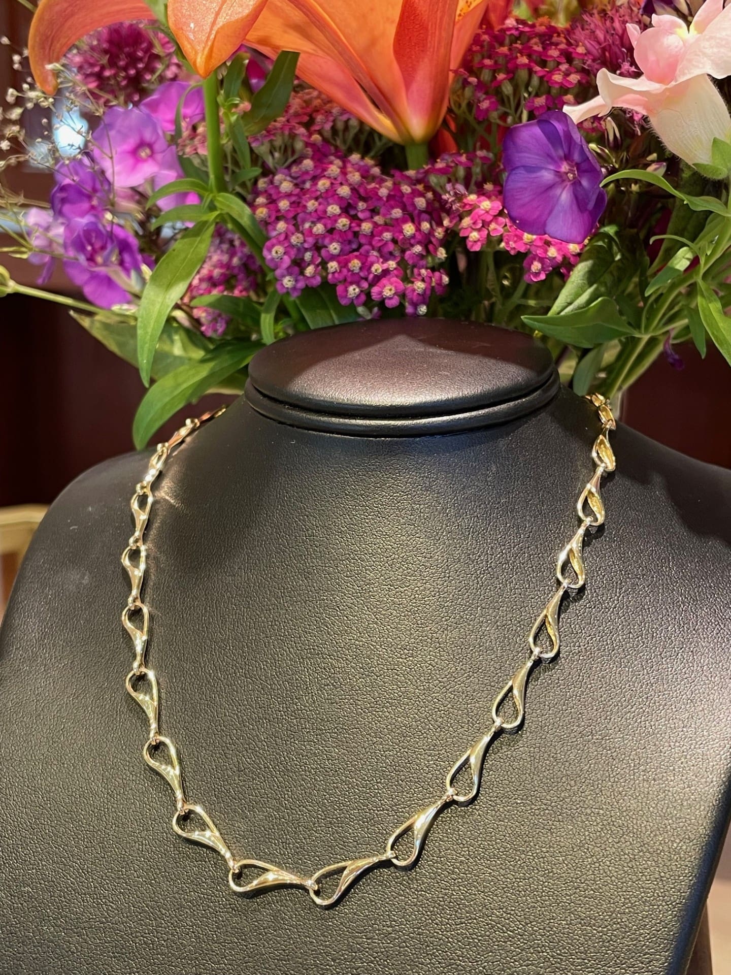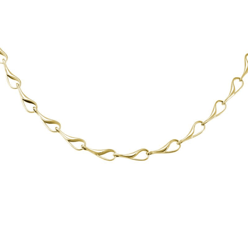 This gold necklace is graceful and fluid, featuring an intricate series of “needle’s eye” links, elongated, sculptural shapes that flow seamlessly together. Each link’s gentle twist captures the light, giving the necklace a sophisticated sense of movement and refined artistry. Crafted entirely in gold, it offers timeless elegance with a modern edge, perfect to wear alone or layered for added drama.