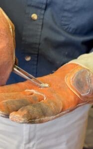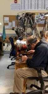 Our jeweler, Mike, hammering the gold into a simple pendant.