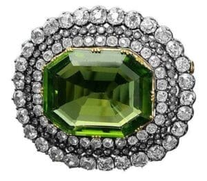 – Hapsburg Peridot Parure, fashioned in 1820 by Court Jeweler Kochert. Auctioned in 2001 by Sotheby’s London to Fred Leighton, who loaned to Joan Rivers for the 2004 Golden Globe Awards. The collection has been sold separately since its 2006 purchase by philanthropist Lily Safra.[8]