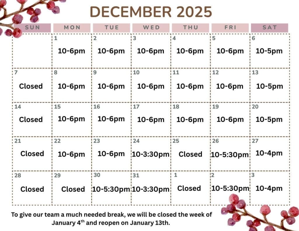 Open Monday through Friday, 10am – 6pm and Saturday, 10am – 5pm for the month of December.